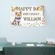 Happy birthday party banner Cute fluffy wolf cub wild one woodlands birthday party banner, with brown fall leaves, nice for fall winter time wolf themed birthday party.
