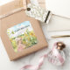 Cute stickers for a little girls birthday featuring a background of a field of sunflowers, with a vintage girl in pink picking sunflowers with a kitten.