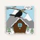 The snow just stopped and a cute blackbird is singing happily perched on the roof of his snowy house. The birdhouse is hanging from a branch. The landscape depicts a winter scene with snow, pine trees and mountains. This cartoon illustration is an ideal gift for people who love birds, winter and music.