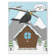 The snow just stopped and a cute blackbird is singing happily perched on the roof of his snowy house. The birdhouse is hanging from a branch. The landscape depicts a winter scene with snow, pine trees and mountains. This cartoon illustration is an ideal gift for people who love birds, winter and music.