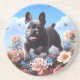 A happy grey puppy runs through colourful flowers and butterflies in this pretty design.