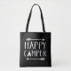 Custom printed tote bags with trendy black and white "Happy Camper" typography quote. Design features a tribal arrow border and cute teepee graphic. Use the design tools to choose any background colour, add your own text and photos to create a unique one of a kind design.