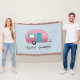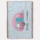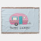 Pink RV trailer illustration with "Happy Camper " text on light blue background