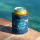 Happy Camper RV Summer Vacation Wanderlust Can Cooler with aqua teal design for the Happy Camper words with an RV. The background is marbled blue and grey design.