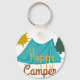 Super cute camping and glamping Happy Camper logo design in teal blue, gree, brown, orange and yellow.