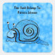 This square sticker bookplate label has a cute happy cartoon snail who has a patterned shell in shades of blue on a light and dark mix of aqua blues. Customise your text with the templates.