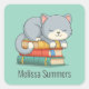 Happy Cat Book Stack Custom Name Bookplate Green Square Sticker