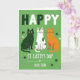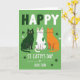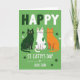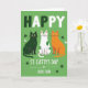 This greeting card shows three stylized cats sitting side by side across the middle of a rich green background, arranged evenly like close friends posing for a photo 💚. On the left is a deep forest-green cat with subtle markings, in the center a white cat dotted with emerald spots, and on the right an orange tabby, all with wide golden eyes that seem to meet yours with a gentle, affectionate calm. Above them, “HAPPY” sits near the top in mixed dark green and white letters, giving the header a two-tone look. Beneath the trio, “ST. CATTY’S DAY” appears in white, centered and easy to spot, with a thin decorative underline tucked right under the phrase. Lower still, “OUR SON” is placed as a smaller line of text, also in white, anchoring the design near the bottom. Dark green shamrocks are scattered around the cats like little lucky tokens ☘️, and small white starburst shapes dot the background for contrast. The overall scene stays flat and graphic, with crisp shapes against the green field, and the orange tabby’s warm coat standing out beside the cooler greens. White starbursts and dark green clovers float around the cats, filling the open space without crowding the centered text.