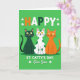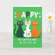 This card shows an emerald green background with three stylized cats sitting side by side like close friends posing for a photo 💚. On the left is a deep forest green cat with a dark-tipped tail, in the middle a white cat covered in bright green polka dots, and on the right a sunny orange cat with a darker striped tail. They face forward with wide yellow eyes, tiny pink noses, and fine black whiskers, their small smiles giving the scene a gentle, affectionate feel. Near the top, “HAPPY” appears in cut-paper-style letters in orange, white, and darker green, spaced across the upper area. Small white shamrocks float around the cats like confetti ☘️. Beneath the trio, the line “ST. CATTY’S DAY, Our Son” is set in white lettering and centered under them. The cats’ simple shapes and tidy row keep the focus on their friendly expressions against the green field dotted with petite shamrocks.