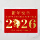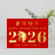 Bold typography Happy Chinese New Year of the horse 2026 red gold Foil Holiday Card. This festive card celebrates the Chinese New Year of the Horse with striking bold typography. It features the phrase "Happy New Year" presented in both Simplified Chinese and English, along with the year 2026, creatively incorporating a snake in place of the zero, all elegantly rendered in gold foil against a vibrant red backdrop. The reverse side of the card is adorned with a captivating pattern of gold diamonds set against the same rich red, enhancing its luxurious appeal and making it a perfect holiday greeting.