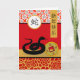 Happy Chinese New Year of the Snake, paper greeting card with a silhouette of a snake coiled up and guarding a Feng Shui good fortune coin. Floral elements are at the top and bottom of the card. A golden banner hangs down with Happy New Year written in Chinese. A calligraphic zodiac symbol for snake is also visible. Art, image, and verse copyright © Shoaff Ballanger Studios.