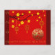 Stylised illustration with yellow "apricot" blossoms, Asian lanterns with red background. Design on horizontal holiday postcard with custom year 2022 and "HAPPY CHINESE NEW YEAR" in yellow + a small "golden" Rabbit paper-cut (image printed) in the corner. You can easily change text (font colour, size and position) + delete the Tiger illustration if you want by clicking the customise button. Matching greeting card. Perfect for Chinese New Year of the Rabbit 2023.
