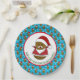 A cute brown Christmas potato wearing a bright red Santa hat with a white trim and a white fluffy pompom. He has a happy smiling face and sticks for arms. Below him in green lettering is a template to add your own message or text to personalise these fun party plates. The outer rim of the plates is a repeat pattern of the same potato with a blue background and sparkly white snowflakes.