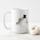 Illustration of a cartoon style Christmas snowman in a snow scene with snow covered houses and a tree in the background.