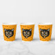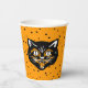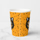 These paper cups have a happy classic Halloween black cat face with open mouth and bright eyes along with orange and white accents on an orange background with tiny black stars.