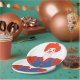 Painting of a happy smiling clown with red hair and shirt, and blue jumper, is printing on custom paper plates for birthday celebrations.