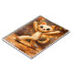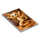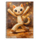 This cheerful illustration features a playful cartoon cat dancing with arms raised and a joyful expression. Rendered in a warm, textured painterly style with soft lighting and glowing background dots, the artwork evokes happiness, movement, and childlike wonder. Earthy tones and a handcrafted look give it a cozy, storybook charm, making this notebook perfect for journaling, sketches, or daily notes with a touch of fun and positivity.