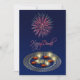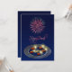 Happy Diwali illustration: A golden mandala with Ganesha Rangoli and 5 diyas on a dark blue background with fireworks.