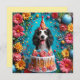 A joyful dog wearing a party hat, surrounded by vibrant flowers and a decorated birthday cake against a bright blue backdrop, exuding joy and celebration in a lively and playful atmosphere.