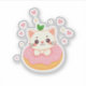 Kawaii cat sitting in a pink frosted doughnut with a small leaf, smiling with rosy cheeks, surrounded by stars and hearts.