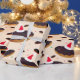 Wrapping paper with a pattern of smiling, chocolate frosted, doughnut wearing santa hats on a tan background.