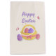 Purple Happy Easter text with basket with Easter eggs and pink butterflies on white background design.