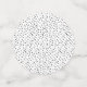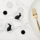 This table confetti has large circles that are white with black polka dots and a black silhouette bunny with a white flowered design and the text Happy Easter. Medium circles are white with black dots, small circles are black.
