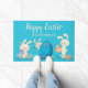 Brighten up your Easter decorating with this Happy Easter doormat that's ready to be personalised with your name and features a cute illustration of three bunnies with painted Easter eggs set against a bright turquoise blue background.