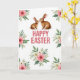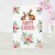 This design shows two soft brown hares near the top, facing each other closely as their dark eyes meet in a gentle, affectionate pause 🐇. The larger hare sits on the right, while the smaller one on the left leans in with a fluffy white tail showing, giving the scene a sweet, friendly closeness. Below them, the words “HAPPY EASTER” sit centred in bubblegum-pink letters that stand out against the pale background. The text is placed just under the hares, leaving comfortable white space so the animals remain the main focus. Around the edges and corners, clusters of spring flowers in blush pink, creamy white, and pale yellow mingle with green leaves and thin branches 🌷. These botanical accents frame the middle without crowding it, guiding your eye back to the hares and the message. Everything rests on a bright white background with soft, even lighting. The top corners show the densest floral sprays, with small petals and leaves curling inward towards the pink lettering.