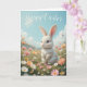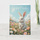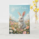 A joyful Easter greeting card featuring an adorable bunny surrounded by beautifully decorated eggs.