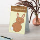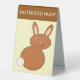 This awesome table tent Easter egg hunt sign features an adorable image of a happy Easter bunny created using vector art. The bunny is brown with a white tail. It has a big smile on its face just like an Easter bunny should. There is custom text on the front and back so you can personalise your sign.