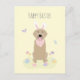 A cute illustration of a golden retriever dog wearing bunny ears and a cute Easter bandanna. Surrounded by decorated Easter eggs, spring flowers and butterflies.
