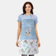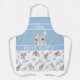 The top half is blue with white polka dots and has a precious bunny rabbit peaking over the top of a banner that says Happy Easter. Below the banner is a pattern of Easter bunnies and flowers. Near the top is a banner where you can personalize the apron with your name. Happy Easter is also customizable so you can change that if you like or delete it.