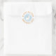 Celebrate Easter with this charming round sticker featuring a sweet white bunny with a blush pink flower and leaf accent, framed by a soft blue scalloped circle. The vintage-style serif lettering reads "Happy Easter" and includes your family name and year for a personal touch.