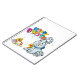 Cute Easter illustration with two baby chicks and the Easter Bunny with colourful balloons spelling out Happy Easter above them.