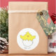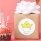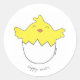 This sticker is printed with a hand-drawn, happy, and partly hatched baby chicken.