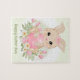 Cute Easter jigsaw puzzle with a bunny, pink egg and pink spring flowers. Easily personalise the text. - Kate Eden Art