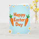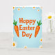 This greeting card centers on the words “Happy Easter Day” in thick, rounded orange lettering with a soft glow, giving the message a cozy, welcoming look 🌷. The text sits prominently in the middle, like a cheerful note meant to be read first, and its warm tone feels like a friendly hug shared between close friends. On both the left and right sides, two tall orange root vegetables mirror each other, their tapered shapes leaning inward as if keeping the greeting company. Each one is topped with a burst of leafy greens, adding a fresh contrast that suggests a gentle, caring touch in the arrangement 🐰. Behind everything, the background fades from a lighter sky blue near the center to a deeper blue toward the edges, creating an open, airy setting. Small white flowers with sunny yellow centers are scattered around the border, forming a soft frame that guides your eyes back to the greeting. The orange lettering sits between the paired vegetables, while the white-and-yellow blossoms dot the blue field like a loose floral ring.