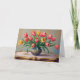 A graceful Easter design showcasing a lush bouquet of pink and yellow tulips arranged in an ornate blue vase atop a gilded table. Set against a softly textured neutral background with refined script lettering, this artwork conveys elegance, renewal, and springtime beauty.
