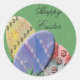 Colourful labels imprinted with uniquely designed eggs and the greeting of Happy Easter.