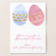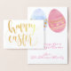 Happy Easter in Gold Foil on the front. Pastel and gold eggs with your personalised message for the Easter holiday.