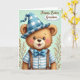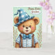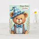Designed with a cuddly, bear-like character in a close-up portrait, this illustration features russet fur, round cheeks with a gentle blush, and big sparkling eyes paired with an open smile that feels warmly directed at the viewer 🐰. A blue-and-white check cone hat sits slightly tilted, adding a friendly, dressed-up touch. The character wears a blue-and-white striped shirt under caramel-toned overalls with shiny brass-like buttons, finished with a sky-blue bow tie that suggests a sweet, affectionate occasion. Behind it, a muted mint-green background keeps the scene calm and springlike, letting the warm fur tones stand out. On both sides, slim branches with small golden-brown buds frame the portrait like a quiet nod to early spring 🌷. In the upper right area, the words “Happy Easter” appear in flowing dark lettering, with “Grandson” set inside a small rounded bubble nearby. Soft, diffuse lighting smooths the shadows across the fur and clothing. The mint background is bordered by the budding branches, while the blue bow tie and check hat echo the blue text in the top-right corner.