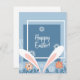 Blue background, white frame with cute easter bunny ears, flowers and foliage at bottom, says Happy Easter