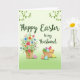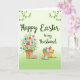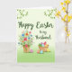 This card features the greeting “Happy Easter to my Husband” in dark green lettering placed at the centre of a pale green background, with small vine accents curling into the upper corners. Below the words, the scene feels affectionate and close, as if it’s setting the table for a quiet holiday moment shared between two people. On the left sits a terracotta-coloured flower pot overflowing with blossoms in fuchsia, sky blue, sunny orange, and soft purple, tucked among leafy greens and a few 🌷 touches. On the right, a warm brown bowl holds several smooth egg shapes in emerald, lavender, light blue, and golden yellow with stripes, suggesting a sweet tradition done together 🐰. The ground fades in gentle green tones, giving the objects a soft place to rest without harsh lines. A few extra eggs, some striped and some solid, are scattered nearby like little surprises waiting to be found. The pale green field stays open and airy around the central text, while the pot and bowl balance each other across the lower half of the design.