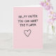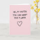 This card sits on a soft blush-pink background that feels gentle and inviting, with a flirtatious edge 🌷. Centred near the top, thick black hand-drawn lettering reads “HA_PY EASTER,” leaving a noticeable gap where one letter should be. Just beneath it, the same black text continues with “YOU CAN INSERT THE P LATER,” turning the missing letter into a cheeky little nudge between close friends or a couple 🐰. The letters look slightly uneven and casual, like a quick note dashed off with a marker, which makes the joke feel more intimate. The strong black text stands out sharply against the pale pink, keeping your eyes on the message and the blank space. Lower on the card, a simple black heart outline sits centred, echoing the relaxed line style of the words and adding a tender, teasing touch. The heart is drawn with a thick black line and rests in the lower half of the pink field.
