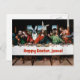 Happy Easter, Jesus! Funny Easter Postcard Remake of Last Supper of Leonardo, Easter theme with Jesus wearing rabbit ears, bunny mascot and two plates of Easter eggs
