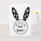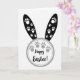 This greeting card features a bright white background with a simple bunny-like shape, where a rounded circle sits below two tall, tapered ear forms. The ears are solid black and dotted with small white paw prints, like little tracks that feel close and affectionate. Around the circle is a soft gray dotted border that adds a gentle frame without crowding the space. Inside the circle, more gray paw prints are scattered in a loose pattern, suggesting two friends or sweethearts strolling side by side 🐇. The text “Happy Easter!” sits centered within the circle in dark lettering, standing out clearly against the pale interior. The limited palette of black, white, and grays keeps the look calm and modern, while the paw prints add a tender, companionable touch 🌷. The dotted ring is light gray, and the paw prints vary slightly in size as they drift across the circle.