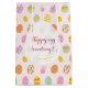 The sides and back of the bag feature a delightful hand-drawn watercolor gouache pattern of pastel-painted eggs in yellow, green, pink, and blue. Each egg is decorated with playful polka dots, zigzags, diagonal lines, and adorable Easter icons like carrots, rabbits, and chicks, set against a soft pastel pink background.