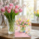 This greeting card showcases a watercolor-illustrated pink tulip arrangement on the front, complemented by an Easter holiday message on the back, along with a signature line for personalization. Specifically designed for family use, this Easter card allows for customized text to suit individual preferences. Furthermore, this versatile template image can be applied to other products.