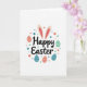 This card features the words “Happy Easter” in deep black lettering centered on a bright white background, with the message sitting like a friendly note at the heart of the design. Just above the text, two soft beige bunny ears with warm reddish-orange inner details peek in, as if a shy friend is leaning over your shoulder 🐰. Around the greeting, decorated eggs form a loose ring that feels like a gentle hug circling the words. The eggs are colored in calm teal, coral, and mint green, and they carry simple patterns such as horizontal stripes and neat rows of dots that suggest careful attention and a sweet, affectionate mood. Small dots in matching shades are scattered between the eggs, adding a light, floating texture that keeps the scene lively without looking busy 🌷. The text stays clearly readable in the center, while the surrounding shapes guide your eyes back toward it again and again. A few of the dots are slightly larger than the rest, sprinkled unevenly around the eggs near the edges of the layout.